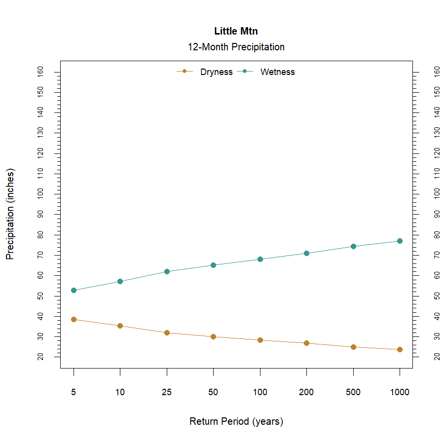 This chart shows the range and probability of specific precipitation totals. For example, there is about a 2% chance of getting just 35 inches of precipitation in a year. But if you look at the distribution of rainfall (historical rainfall amounts are shown by the blue bars, while the line graph smooths out this distribution), you can see that most years you are likely to get more precipitation than 35 inches.